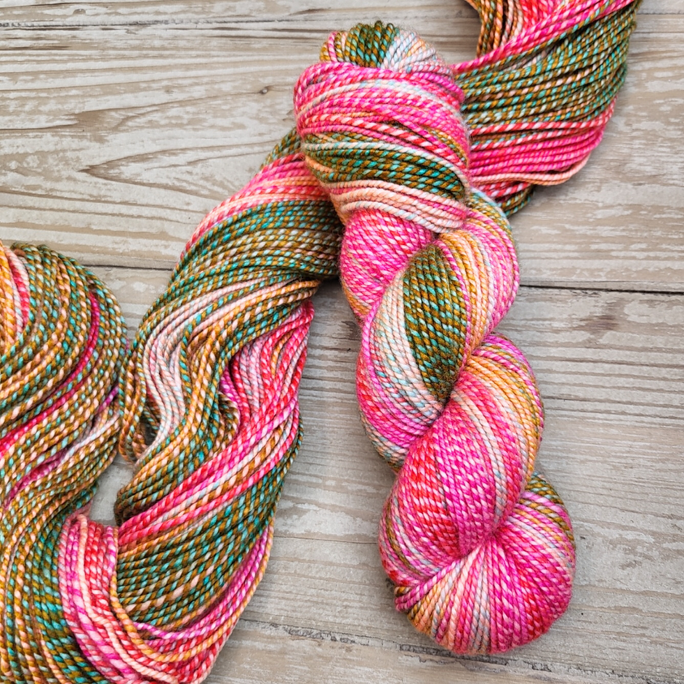Jeder dieser Wollkammzüge wird - von Hand gefärbt, gesponnen und verzwirnt.